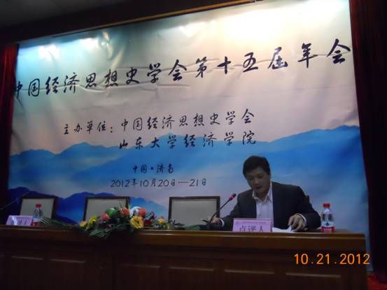 2012年10月20-21日,由中国经济思想史学会主办,山东大学经济学院承办的中国经济思想史学会第十五届年会在山东大学举行。来自中国社会科学院、北京大学、清华大学、北京师范大学、复旦大学、武汉大学、山东大学、上海财经大学等高校、科研院所的100余名专家学者出席了本次年会。我校经济学院邹进文教授、瞿商教授、朱华雄副教授、宋丽智副教授向大会提交论文并应邀参加了本次年会。与会代表围绕“中国经济思想的变迁与齐鲁文化的本土化、国际化研究”这一主题进行深入研讨,取得了丰硕的成果。中国经济思想史学会会长、武汉大学商学院严清华教授做了工作报告,并对半岛线上平台经济思想史专业在2012年度获得一项中国社科基金项目(邹进文教授)、两项教育部人文社科基金项目(朱华雄教授、宋丽智副教授)进行了高度的赞扬和祝贺。