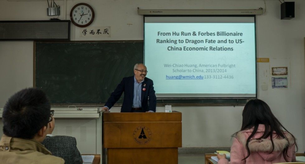 2014年3月20日下午2:30,来自西密西根大学、美国富布赖特学者WEI-CHIAO HUANG(黄维乔)教授来我校讲学。此次讲座由经济学院主办,经济学院的金应华老师主持了此次讲座,来自学校不同年级的本科生、研究生挤满了文澜楼202教室,享受了一次机会难得的学术盛宴。