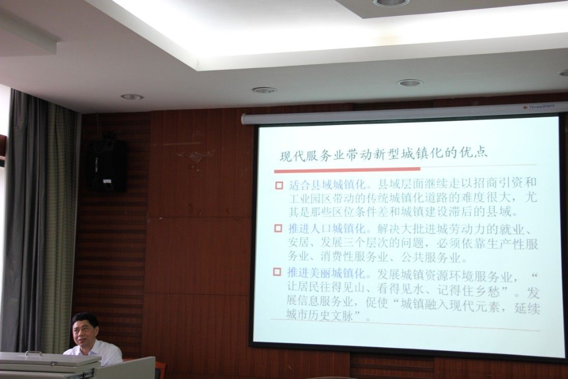 (通讯员 杞如福)2014年5月9日,由经济学院主办,邀请长沙理工大学经济管理学院王耀中教授讲授的学术讲座——“新型城镇化与现代服务业融合发展”在文泉楼经济学院会议室举行。本次讲座由经济学院院长、博士生导师邹进文教授主持,经济学院副院长罗良文教授,陈银娥教授,杨波教授等经济学院各学科老师代表出席参加了本次讲座。