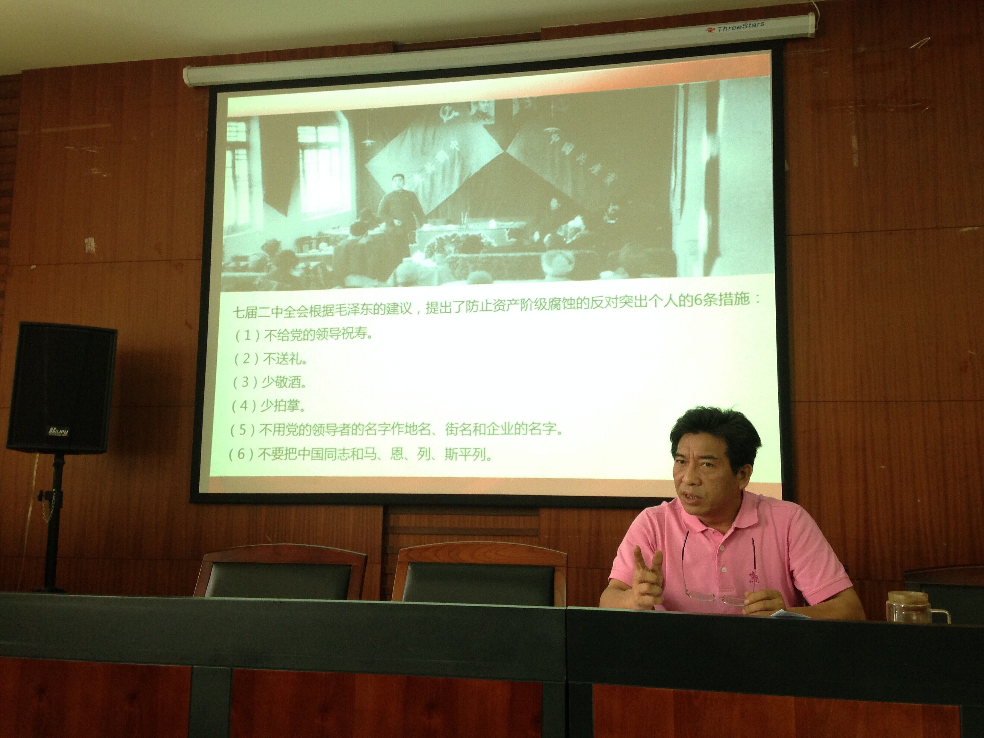 2015年6月11日下午14:30,我院响应学校党委的号召,在文泉楼206会议室举行了“三严三实”的专题党课,学院全体教职工及学生代表参加了党课学习,党课主讲人为经济学院党委书记武身汉。 本次专题党课,武身汉书记主要针对三个主要问题给与讲解,一是“三严三实”的理论背景;二是“三严三实”的理论内涵;三是如何践行“三严三实”。