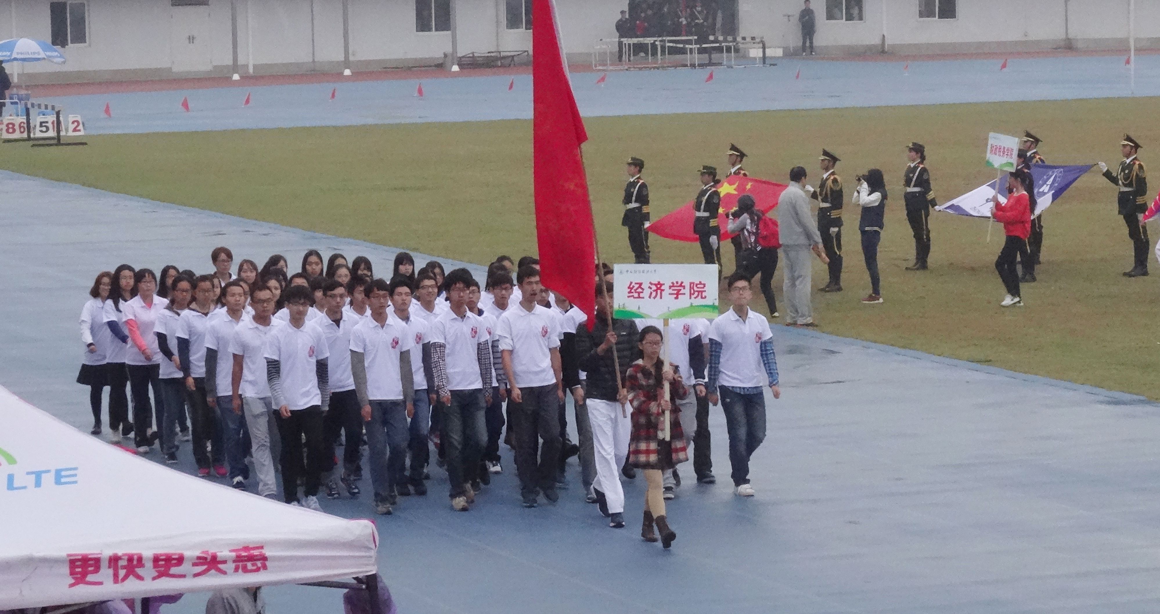 (新闻与网络技术部 黄朝阳 王洁)2015年10月29日上午8:30,中南财经政法大学2015年校运会在南湖校区体育中心隆重开幕。校党委书记张中华,校长杨灿明,校党委副书记王文贵,副校长姚莉、陈明,校长助理邹秉国等学校领导出席了开幕式。 开幕式由副校长姚莉主持。大会开始,天空中飘着蒙蒙细雨,伴随着《运动员进行曲》,运动员、裁判员入场。经济学院的运动健儿们,身着经院队服,哪怕在风雨中,也依旧精神抖擞。他们迈着坚定自信的步伐,缓缓走来。相信在运接下来的比赛中,他们必将会追求更高更快更强的目标,在中南大运动场上挥洒青春的汗水。