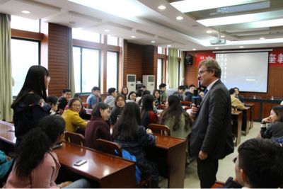 Olivier Aptel先生对杨校长的接待表示感谢,并全面介绍了雷恩高商的有关情况,他希望能与我院在联合培养、组织学术科研活动、交换教师等方面进行进一步长期、有效的合作。Olivier Aptel先生生动和内容丰富的讲解赢得了在场师生的热烈掌声,交流结束后他还与师生进行了友好的互动与交流。最后大家一起在文泉楼下进行了合影。同学们都表示,经过此次与Olivier Aptel先生的交流见面,大家对赴法读研的生活有了更大的憧憬,也愈发觉得动力十足。