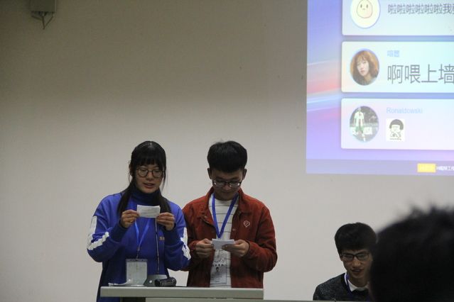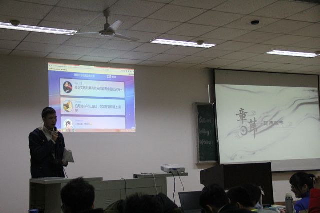 接下来就是邹睿的补充,他侧重于社会活动与实习,并且为我们隆重地介绍了我院获得国家优秀团队的枝江行活动以及我校重点实践活动咸宁行,极大地带动同学们的积极性,许多同学纷纷在微信墙上询问何时能够报名参加。除此之外,邹睿还详细地介绍了我校在2012年第十二届挑战杯赛中获奖的八件作品以及我院2014年入围校级决赛的二十五件作品。我院同学在听完介绍之后,无不跃跃欲试,眼里洋溢着希望的光芒。