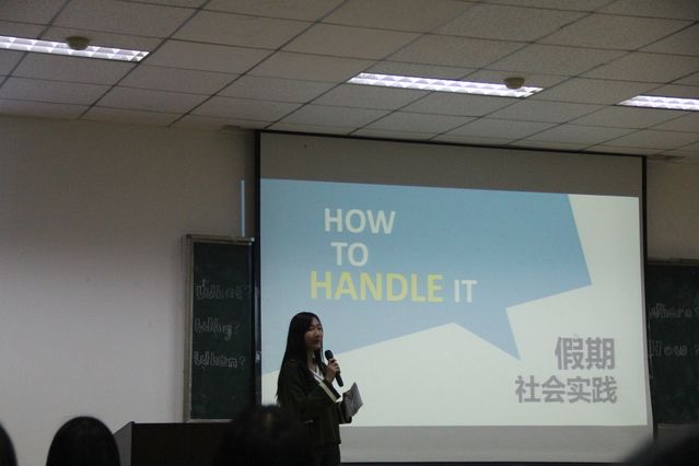 在主持人介绍完嘉宾之后,首先上台为大家分享实践经验的是杨梦圆。她分别从选题、撰写、实地调研、注意事项、个人感悟五个方面具体地为大家带来了许多有用的经验。她说选题方向可以从时事热点、政策导向、社会问题、所学专业四个方向考虑,但是选题不宜过大,而且还要考虑可行性、现实意义、准确性和创新性。具体步骤一般是发现问题-搜集资料-确定思路-拟定标题。然后杨梦圆为我们展示了申请书结构、文献综述的写法以及如何查找文献资料和研究思路图,最后她还分享了一些细节问题的处理方法和自己在社会实践活动中的心得。在场的同学无不因她的讲述而热血沸腾。