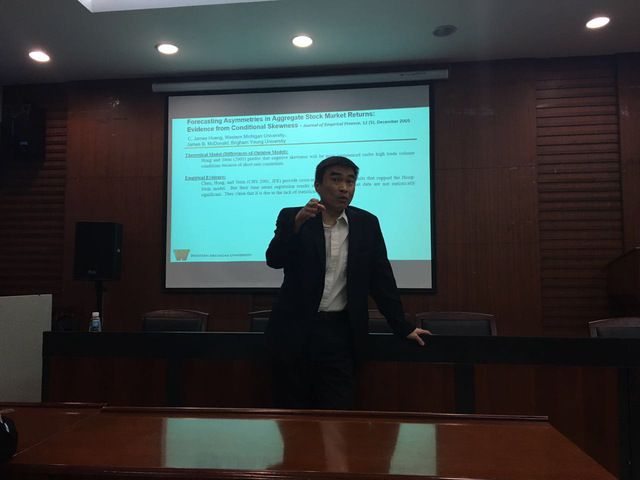 讲座采取了与论文相结合的形式。首先,Hueng教授从意见分歧模型开始,指出在受到卖空条件的限制以及贸易量很大的情况下,负偏态最为明显。由于美国没有卖空限制,该模型并没有得到验证,相反,中国的数据验证了模型的正确性。接着,Hueng教授讲解了分散化投资问题。分散化投资可以减少非系统风险,但是,实证研究发现投资者并没有倾向于选择更多股票的证券组合,超过10支股票的持有者比例小于5%。投资者更关心正偏态和VaR问题。然后,Hueng教授分别从企业和国家层面数据分析了特异性波动率的差异,他详细讲解了采用道琼斯指数建模时对数据的处理方法,介绍了SGAT分布与GARCH模型的广泛应用,以及时变贝塔的替代建模策略——状态空间模型。最后在大家热烈的掌声中,Hueng教授结束了本次讲座。