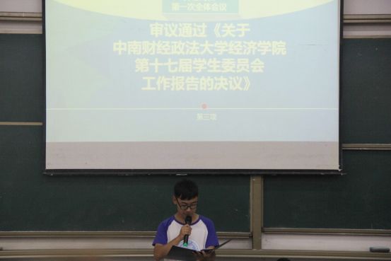 本次大会由经济学院第十七届分团委常委王苗主持。首先召开的是本次大会的预备会议,全体学生代表听取了大会筹委会主任所作的会议筹备工作报告,审议并通过了大会代表资格审查报告,表决并通过了学代会主席团、秘书长建议名单,表决并通过了大会会议议程。最后全体代表学习了会议须知和有关注意事项。