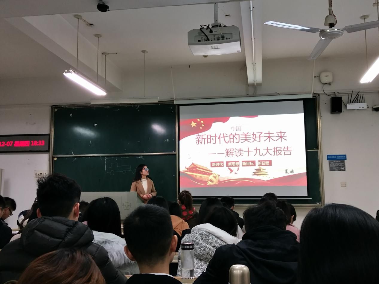 西方经济学专业夏欢同学做了题为《新时代的美好未来》的宣讲报告。2017年10月18日,中国共产党第十九次全国代表大会在北京人民大会堂开幕,习近平总书记作了题为《决胜全面建成小康社会夺取新时代中国特色社会主义伟大胜利》的报告。大会主题为““不忘初心、牢记使命”,高举中国特色社会主义伟大旗帜,决胜全面建成小康社会,夺取新时代中国特色社会主义伟大胜利,为实现中华民族伟大复兴的中国梦不懈奋斗。”夏欢同学从新时代,新思想,新使命,新征程四个方面作为切入点,带领全体与会研究生解读十九大报告。