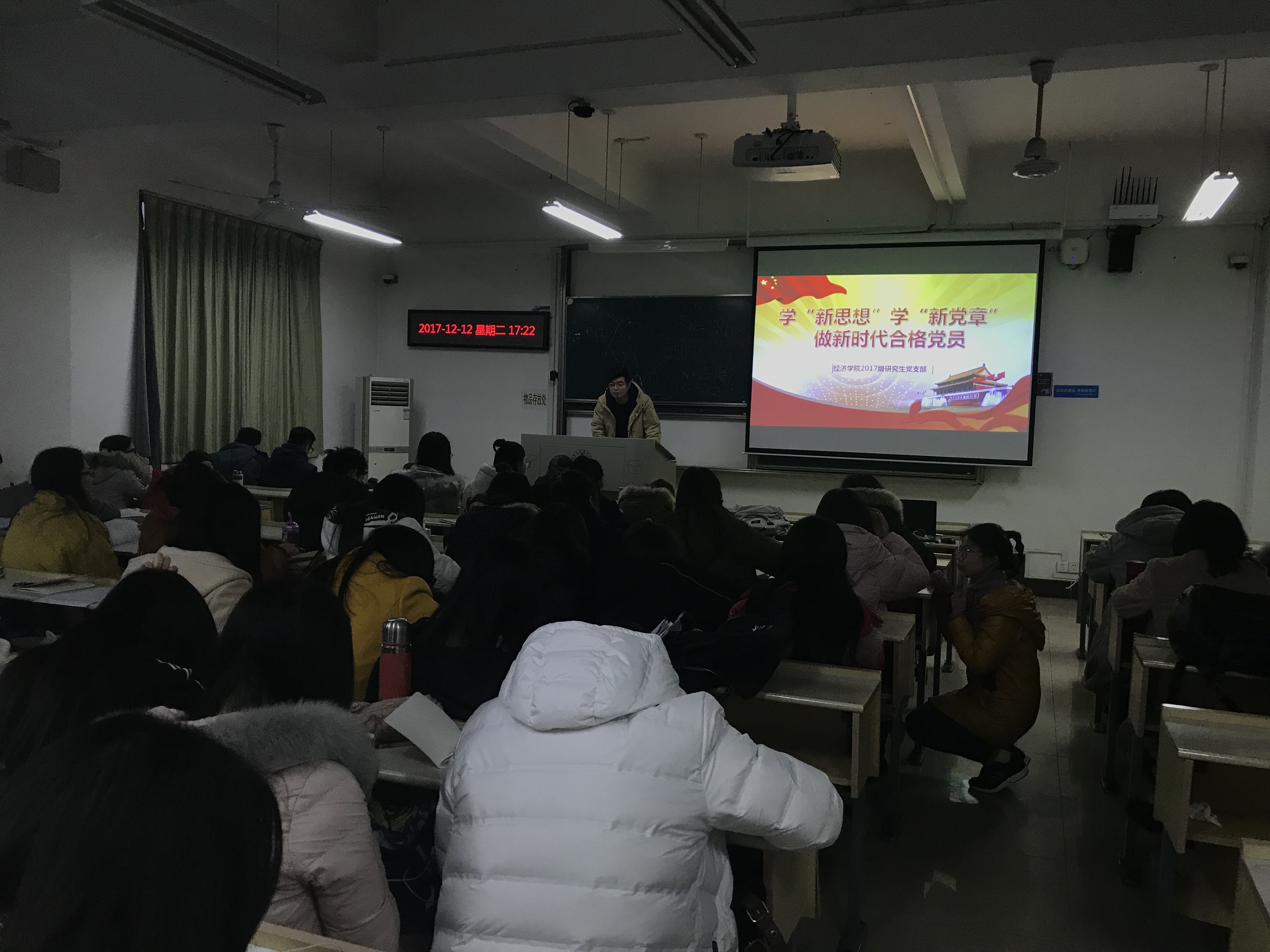20171212日下午,经济学院2017级研究生党支部在文添楼202教室举办“学新思想,学新党章,做新时代合格党员”支部主题党日活动,活动由党支部书记胡静主持,全体党员参加学习。会上,全体党员共同颂唱了国歌,重温入党誓词,集中学习了《中国共产党章程》选段部分党员代表发言畅谈十九大学习的心得体会。