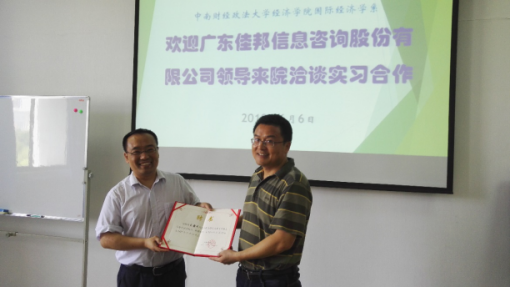 李小平副院长首先介绍了我院情况和本科生实习要求和安排计划,感谢广东佳邦信息咨询股份有限公司提供的实习机会和合作平台。元露风高级顾问介绍了佳邦信息-中南财经政法大学校企合作在校学生2018年暑期实习计划,就公司情况、实习目的、实习定位、实习计划、实习阶段和内容、注意事项,补贴及薪酬福利,乃至通勤方面都作了说明。此次实习安排在广东佳邦信息咨询股份有限公司武汉分公司,地处汤逊湖光谷总部空间,交通近便。神勇总监就协助高校做好在校大学生培养工作,加强校企合作,拓宽合作渠道与我院老师进行了商谈,就校企合作平台建设、软件技术、项目支持、实训安排、联合培养等方面达成共识。
