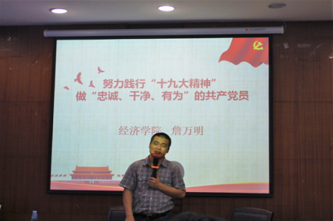 (撰稿:苏颖 拍摄:邱海韵 审核:宋昀宜)2018年6月6日下午,经济学院党委副书记詹万明老师于文泉南206会议室,给学院全体毕业生党员讲授“努力践行十九大精神,做忠诚、干净、有为的共产党员”的专题党课,经济学院团委书记宋昀宜老师、14级本科生辅导员周琼老师、研究生辅导员岳明泽老师参加了党课学习。