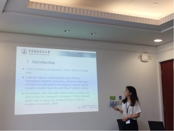 在会议平行论坛中,经济学院博士生牛晓迪报告了其与导师李小平教授合作的论文《Does the International Trade Affect the China's Provincial Biased Technical Change?》。文章认为外贸依存度和出口依存度对大部分地区的偏向型技术进步有着显著的负向影响,而进口依存度的影响程度弱于前两者。为了促进技术进步和经济发展,政府应充分认识地区差异,因地制宜,同时提高能源利用效率。