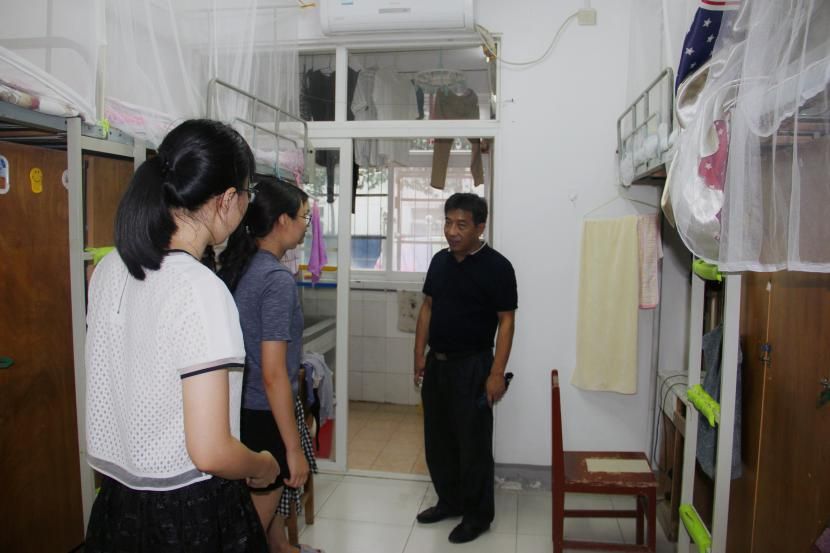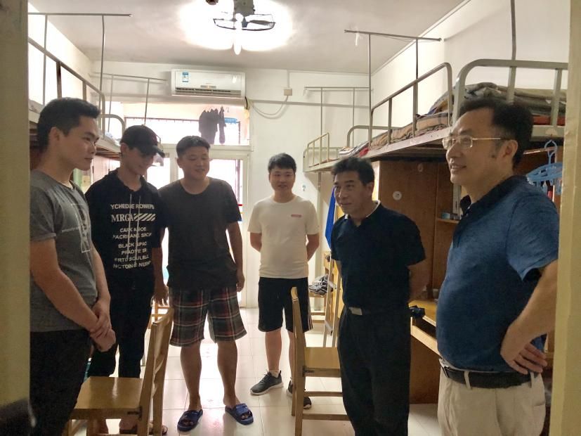 武身汉书记一行先后前往了环湖5栋、9栋、17栋学生宿舍,耐心询问了学生们的本科高校、来到武汉的适应情况、生活状况等贴切学生学习、生活的相关问题,走访过程中,武书记亲自确认了宿舍床板的稳定性,嘱咐大家尽快适应新的环境。在交流过程中,罗院长看到宿舍空调温度过低,细心提醒大家26度较为适宜,谨防感冒。新生们对开学事项存在的很多疑惑,岳老师则耐心地一一为其解答。面对学院领导们和蔼可亲的态度和幽默风趣的言谈,新生们从约束拘谨逐渐转变为畅所欲言,气氛十分融洽。虽然外面下着瓢泼大雨,但热情的话语,亲切的问候,让宿舍楼里处处弥漫着浓浓的师生情谊。