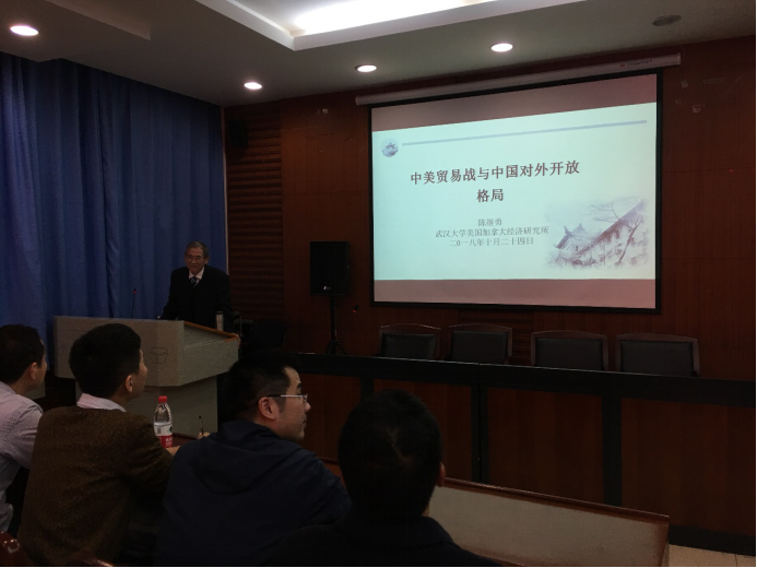 由半岛线上平台举办的学术校庆、名家讲坛学术研讨会于10月24日晚18:30在文泉南楼206会议室顺利举办。本次研讨会邀请到了武汉大学珞珈杰出学者、二级教授陈继勇教授。陈教授给大家分享了以“中美贸易战与中国对外开放格局为主题的讲座。经济学院李小平教授为本次研讨会的主持人。其中,经济学院的杨波教授、余娟娟副教授、吴珊珊副教授、周强博士、谢靖博士、潘安博士等,以及部分博士生和硕士生参加了本次学术研讨会。