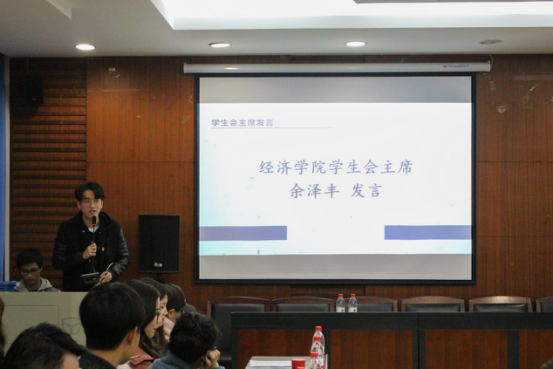 首先是会议第一项,主席讲话。三院主席分别就如何做一名优秀的学生干部、如何应对学生会体制改革及未来的工作重点、院级沟通的重要性等重点方面发表了自己的看法。经济学院学生会主席余泽丰告诉大家要端正心态、严谨求实,共同促进活动提档升级,推进学生会改革再出发;工商管理学院学生会主席彭跃辉强调未来学生会要向服务型学生会转型,并鼓励大家要营造学生会“家”文化;会计学院学生会主席林嘉沁就学生会工作现状及三院学生会工作联合的重要性作出说明并阐述未来三院学生会工作联合计划。