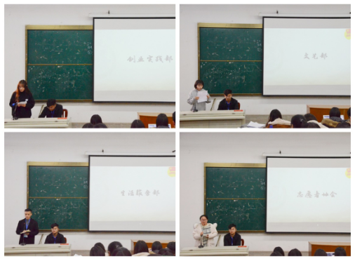 首先,由主持人介绍与会嘉宾,随后,全体参会人员起立,奏唱中国共产主义青年团团歌。奏唱完毕后,由团学志各部门负责人先后上台进行本学期工作总结,对所在部门开展的活动和取得的成果进行了详细的介绍。