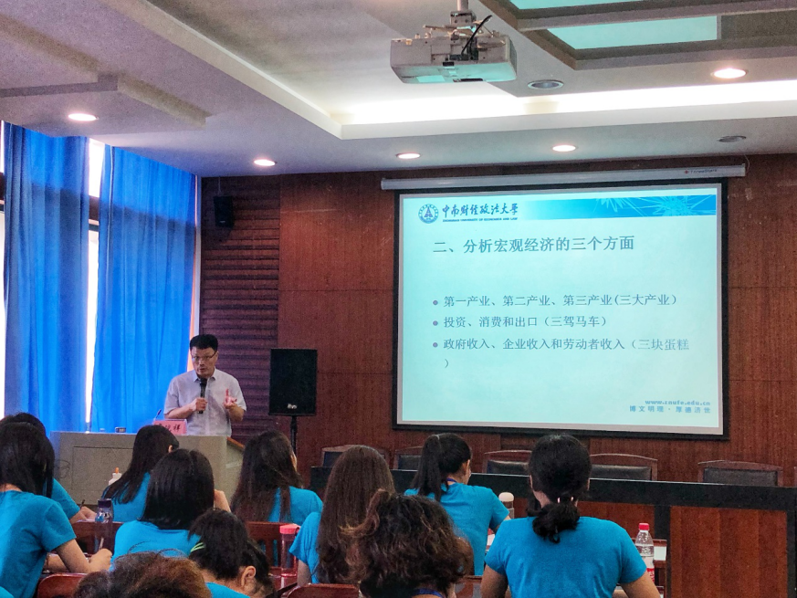 6月12日上午,院长卢现祥教授为营员们介绍了当下中国的宏观经济形势。以中美贸易战为切入点,分析了现在中美贸易战的形势以及中国从中所能得到的启示。并通过分析宏观经济的三个方面:三大产业、三驾马车、三块蛋糕,从中得出“思想”是第一生产力的结论。使营员们对当前的宏观经济形势有了更加深刻的认识。