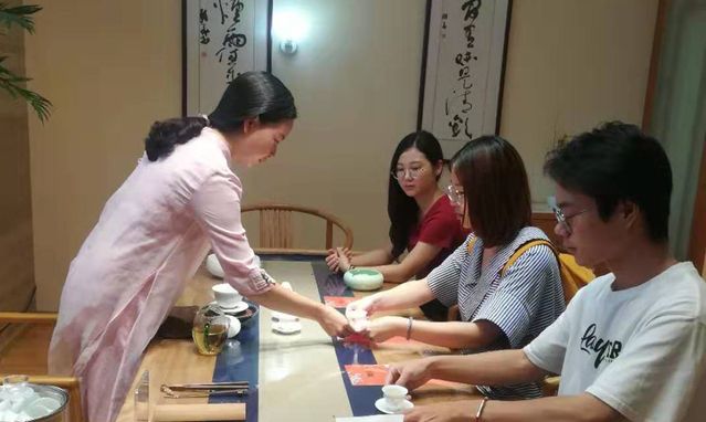 8月27日上午,金果茶业体验馆馆长易乔乔带领暑期实践小分队队员体验了茶道交流,袅袅茶香氤氲中,娓娓道来金果茶业的发展历程,金果茶业起于一片绿叶,却不仅仅止于一个产业,在种茶、采茶、加工制作到市场销售环节间的利益连接、共享机制衍生出新机制。