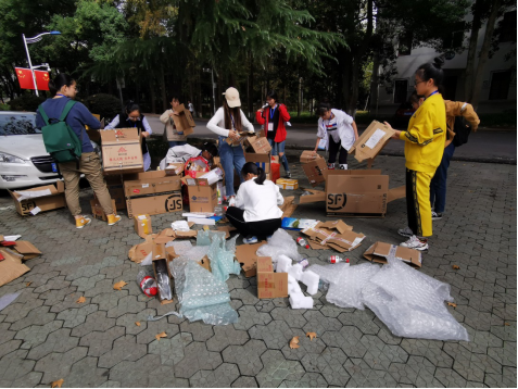 志愿者们对宿舍废品回收完毕后将其统一搬运至电教楼下空地处,并对回收的各类物品进行了归类整理,以方便收废品的工作人员进行回收。在此期间各个志愿者主动参与废品回收整理,丝毫不觉这份工作枯燥乏味。女生们不因与男生们的体力差异而减少工作量,反而帮助人数较少的男生们搬运纸箱,使整个活动过程井然有序。