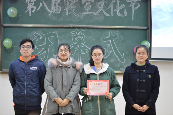 最后,主持人公布了本届寝室文化节的获奖寝室名单,其中获三等奖的寝室为54栋518寝室,中区11栋501寝室,临湖3栋335寝室,获二等奖的寝室为54栋529寝室,临湖3栋415寝室,荣获一等奖的寝室为54栋705寝室,伴随着激昂的颁奖音乐,本届寝室文化节圆满结束。