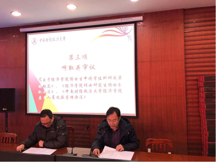 (经济学院副院长罗良文同志向大会作《关于经济学院博士生申请学位科研成果的规定》《经济学院硕士研究生指标分配办法》《半岛线上平台监考人员选派管理办法》)
