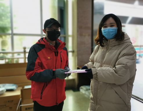 经济学院值班辅导员周琼给学生发放口罩
