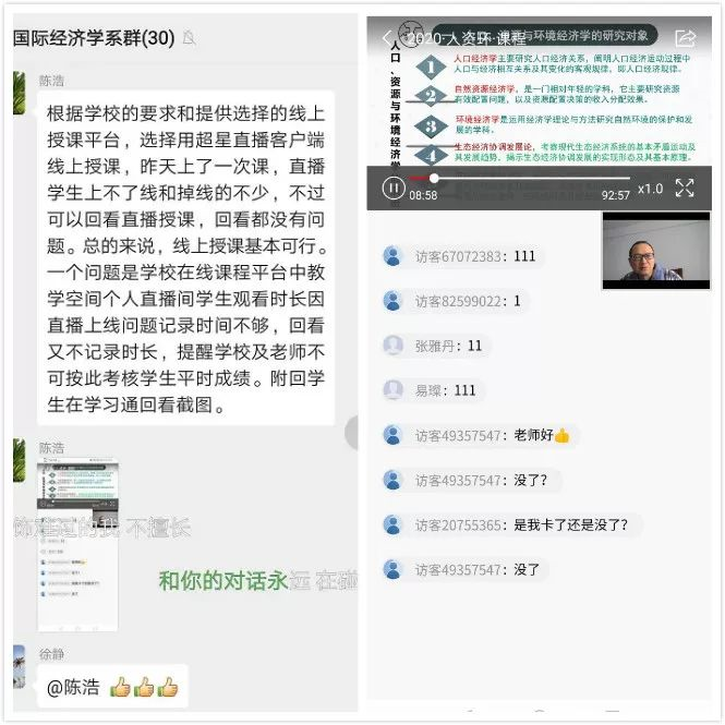 为确保学生学习能达成良好的效果,任课老师都精心准备线上教学,开学第一天,第一节课国际经济学系陈浩老师提前学习、精心准备,开启了线上超星直播,得到教务部领导及同学们一致认可。在线教学是根据当前疫情形势采取的非常规教学方式,在教学过程中难免出现一些技术问题和不适应的情况,学院将会不断听取意见、收集问题,进一步改进、加强和完善,确保在线教学效果。