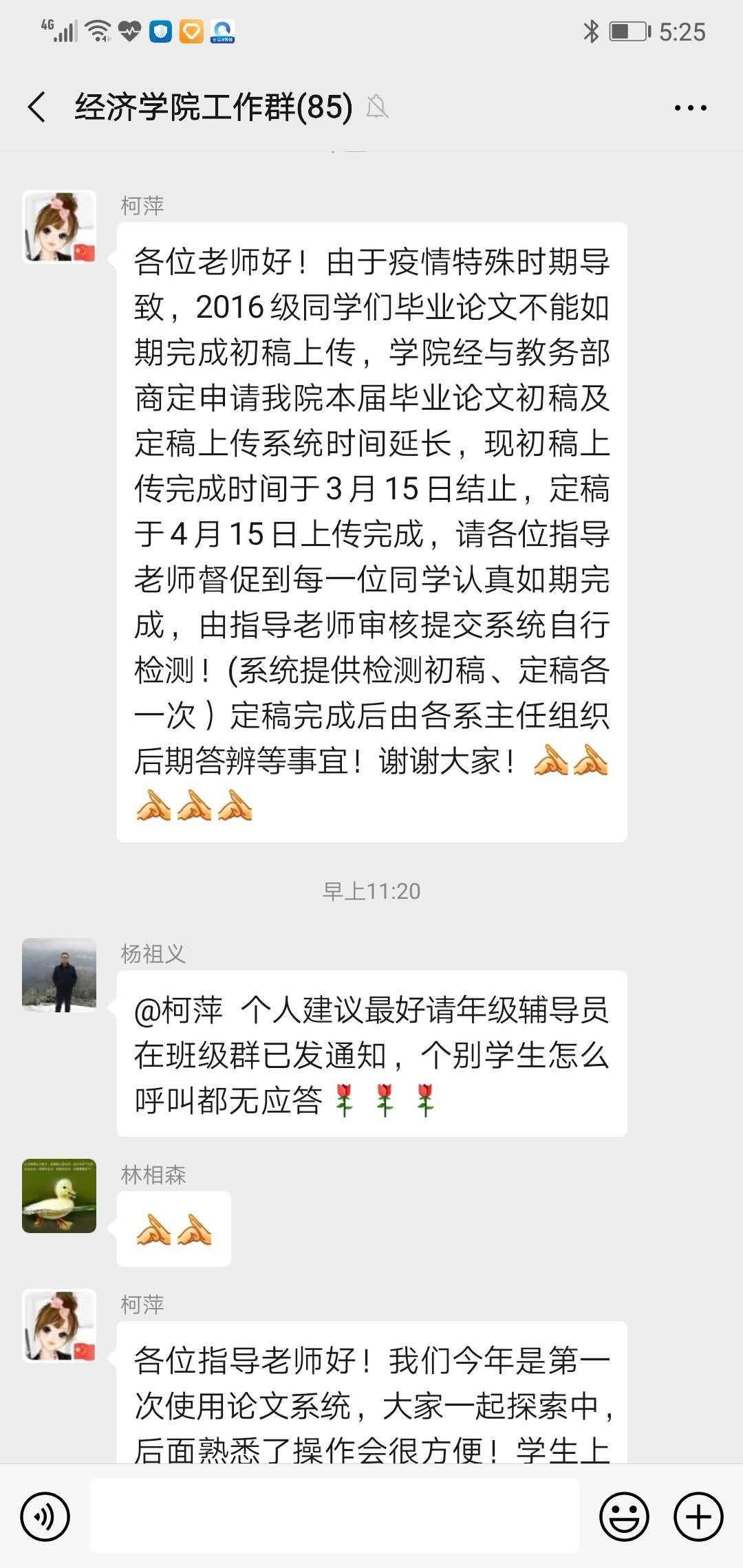 隔离疫情不隔离思想的碰撞。疫情期间,经济学院老师充分利用网络,就学生论文进行督促与指导,师生隔空“对话”,开启了思想的碰撞,点燃了思辨的火花。李小平老师一方面关心学生的身体状况和心理状况,提醒大家加强自我保护;另一方面督促大家努力学习,及时完成毕业论文,并对学生在论文撰写中遇到的各种问题予以耐心指导帮助。