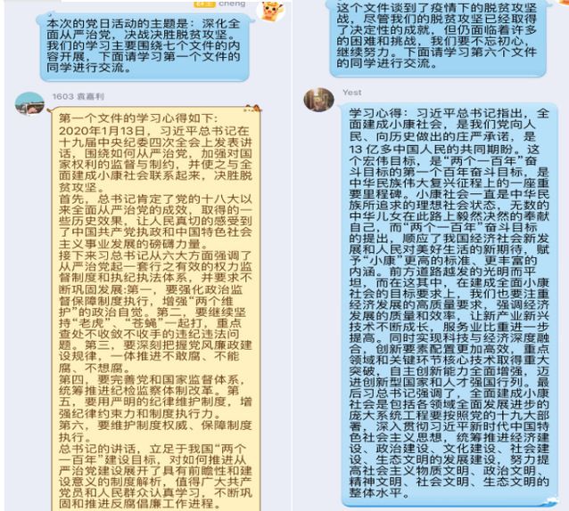 经济学专业本科生党支部通过线上通话的方式召开党日活动,重点学习《习近平在十九届中央纪委四次全会上发表重要讲话》《中国共产党第十九届中央纪律检查委员会第四次全体会议公报》《党委(党组)落实全面从严治党主体责任规定》《教育部召开 2020 年教育系统全面从严治党工作视频会议》《习近平:在决战决胜脱贫攻坚座谈会上的讲话》《习近平新时代中国特色社会主义思想三十讲:第十一讲》《关于持续解决困扰基层的形式主义问题为决胜全面建成小康社会提供坚强作风保证的通知》等文件,并进行了学习心得分享。