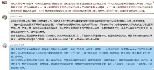 2020517-520日,经济学专业本科生党支部开展 “深化全面从严治党,决战决胜脱贫攻坚”为主题的五月党日活动。由于疫情期间无法以线下形式开展党日活动,经济学专业本科生党支部继续这两个月的党日活动形式,以自主学习、感悟分享与心得体会的方式进行党日活动,全体党员、预备党员参加本次活动。