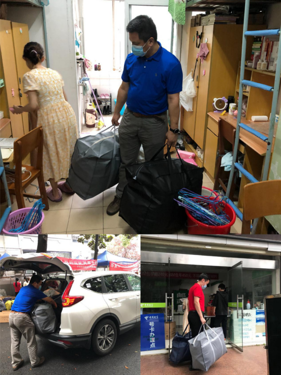 (经济学党支部书记陈立兵、本科生辅导员宋昀宜作为学院教师“爱心使者”帮助学生打包、邮寄行李)
