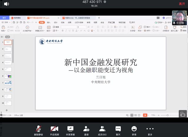 (通讯员:李进纬)7月13日上午,中央财经大学经济学院兰日旭教授,应我院邀请,做了一场题为“新中国金融发展研究——以金融职能变迁为视角”的网络讲座。讲座由瞿商教授主持。