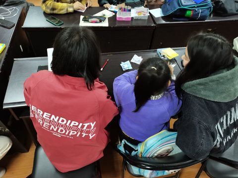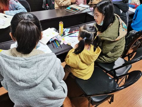 简单的互动结束之后,志愿者们便开始辅导小朋友们的功课。有些小朋友需要学习英语,志愿者们便通过画画的方式教小朋友们学习英语单词;有些小朋友需要完成手工作业,志愿者们便手把手教他们做手工。