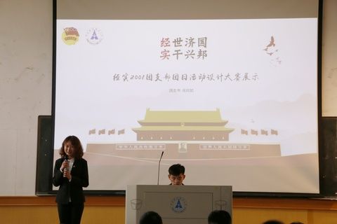 随后,进入团日活动设计展示环节。主持人介绍大赛赛制和比赛流程后,各班团支书依次上台展示。其中,国商1903班团支部通过录制小品表演来讲述道理,让评委和观众们眼前一亮;经济2003班团支部的“三行情书献祖国”活动也是想法独特,令人印象深刻。