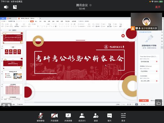 2021年6月18日,经济学院考研考公形势分析“云家长会”在线上顺利召开。本次会议按照学校就业中心的要求,旨在为2022届毕业生及其家长准确客观地分析当前考研考公形势,从而为学生选择毕业方向提供合理建议。会议主讲人为经济学院2018级本科生辅导员周琼老师,2018级学生家长共计100余人参加。