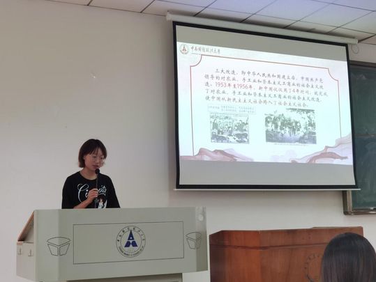 第三部分为1949-1978年的党史,由经实2001团支书肖欣如进行讲解。肖欣如主要从抗美援朝、三大改造、“大跃进”与人民公社化运动讲起,让同学们从历史中汲取精神力量,深入了解中国共产党在建立新中国、进入社会主义初级阶段到迎来改革开放新时代的卓著贡献。