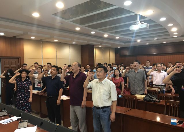 随后,会议进行至第四项——经济学院全体师生党员重温入党誓词,由经济学院组织员罗慧敏同志领誓。