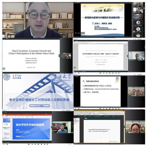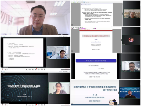 “贸易网络与政策专题”分论坛在《世界经济》编辑部主任毛日昇的主持下顺利进行,分论坛采用了线上研讨模式,由四位学者依次对其成果进行汇报讨论。首先,来自湖北大学商学院的喻春娇教授对《区域生产网络与“一带一路”沿线国家经济联动发展》进行了报告,文章通过构造联动系数的方法,探讨了中国与“一带一路”沿线国家经济联动的动态变化情况以及生产网络分工对于中国和沿线国家联动发展的影响。随后,北京科技大学经济管理学院的李侨敏讲师汇报了题为《Can behind-the-border measures in FTAs benefit domestic firms?》的文章,选择了《区域全面经济伙伴关系协定》为论文研究的自由贸易协定,构建了企业异质性FDI-CGE模型进行研究,发现边界后措施能通过增加企业数量、增加国内外销售额或减轻进口竞争带来的负面冲击,使国内企业受益。接着,半岛线上平台的谢晓晴硕士生做了题目为《进口自由化提高制造业出口竞争力了吗:基于“性价比”视角的研究》的汇报,从产品性价比的视角构建出口竞争力的分析框架,发现中国加入WTO对制造业企业的出口竞争力产生了冲击,以及进口自由化的加深可以显著促进制造业企业出口竞争力。最后,来自合肥工业大学经济学院的盛伟硕士生在《贸易协定网络、制度环境对专利出海的影响机制——挤出效应和补偿机制》研究中,基于USPTO数据库的国际专利数据,检验了贸易协定网络对于专利出海的直接和间接影响大小、差异性和作用渠道,从制度环境视角剖析中国构建制度优势和推动高质量创新的新路径。在四位学者汇报结束后,樊海潮教授、陈勇兵教授和袁凯华副教授依次对专题汇报的四篇文章进行了点评。经过一个半小时的精彩发言和研讨,分论坛顺利完成全部议程。
