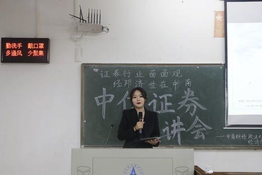 (学生记者郭宇航 摄影王学斌)为了加深同学们对证券行业的了解,明晰个人职业规划,经济学院“证券行业面面观,经邦济世在中南”主题宣讲会于1120日下午2时30分在南湖校区文澜楼107教室顺利举办。本次宣讲会由经济学院分团委创业实践部承办,创业实践部学员李金诺同学主持,并邀请中信证券湖北分公司的陈蔚竹女士和何雅艺女士担任本次宣讲会的嘉宾,经济学院本科生代表到场参加本次讲座。