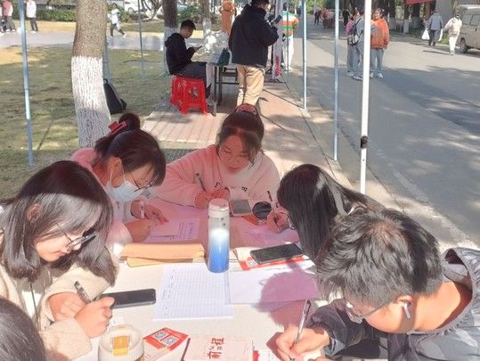 随着校园里跑步和下课的同学们逐渐增多,许多同学被摊点所吸引,纷纷来到桌前咨询活动。志愿者们热情耐心大家介绍活动的内容及意义,出乎意料的是,在这个网络为王的年代,仍有不少同学愿意静下心来写信一封,为远方的家人或在全国各地上大学的故友寄去爱的祝福。临近中午时分,同学们或现场书写,或带来提前写好的信交给志愿者,摊点迎来了人流高峰期。志愿者们分工协作,有的负责封口,有的负责登记信息,有的负责为同学们讲解寄信注意事项和不同寄信方式的区别,忙不亦乐乎。