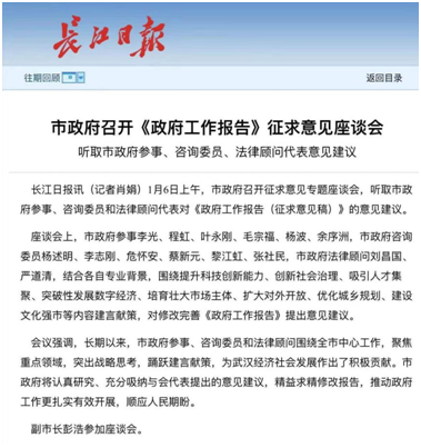 2022年1月6日,武汉市政府召开《政府工作报告》征求意见专题座谈会,副市长彭浩等相关领导出席会议,邀请了六名市政府参事、六名市政府咨询委员、两名市政府法律顾问参会,我院杨波教授应邀出席。会议期间,杨波教授就扩大对外开放、建设区域金融中心、双循环枢纽城市建设等相关问题,对本年度《政府工作报告》提出相关修改意见。