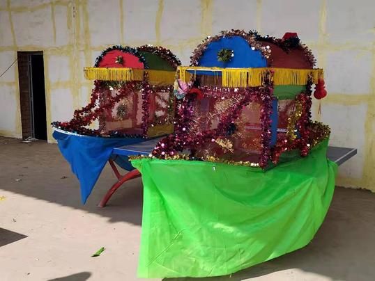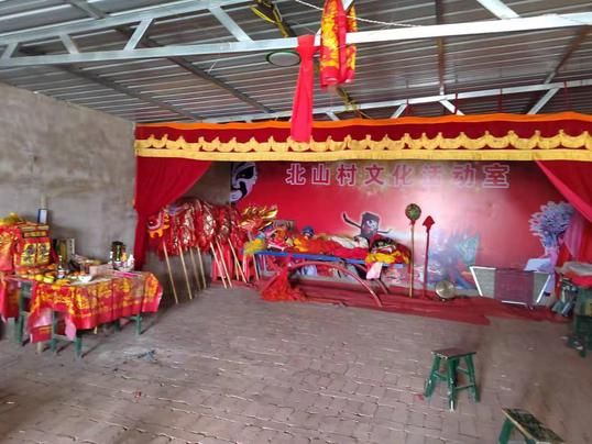 在开展实地调研之前,小组成员通过查阅文献,调查问卷,对比分析初步了解社火发展的现状,之后,利用正值社火展演的春节假期这一时间优势,李馨馨,李国武于2022211日在甘肃省白银市靖远县北滩镇北山村上湾社开展了为期一天的实地调研工作,清晨一早,两位同学驱车抵达社火展演准备地点北山村文化活动室,社火表演还未开始,但准备工作正在如火如荼的进行中,首先两位同学在在当地社火表演负责人的指引下,了解参观了社火表演的道具,器具,映入眼帘的是两只用于舞狮的狮子头道具,两个用于表演舞船的花船,以及用于鼓点节奏的大鼓,进入活动室,进一步参观了相关的服饰道具,与中国传统文化习俗的惯例相一致,从活动室的整体装潢到表演的服饰道具都主要采用红色和黄色为主色调,从中华文化的传统意义上来讲,它代表着吉祥,好运。随后两位同学共同采访了当地的表演人员及负责人员,为了使调研更具代表性,典型性,选择了分别采访老一辈及年轻一辈的人员。