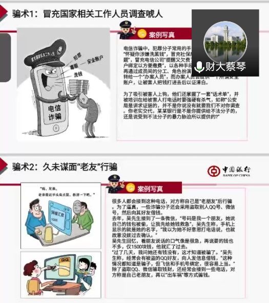 (通讯员:赵萱)92日上午1050,经济学院开展了线上“新生防诈骗”专题讲座,中国银行中南财经政法大学支行蔡琴经理应邀向经济学院全体2022级新生介绍了有关防诈骗的相关知识。