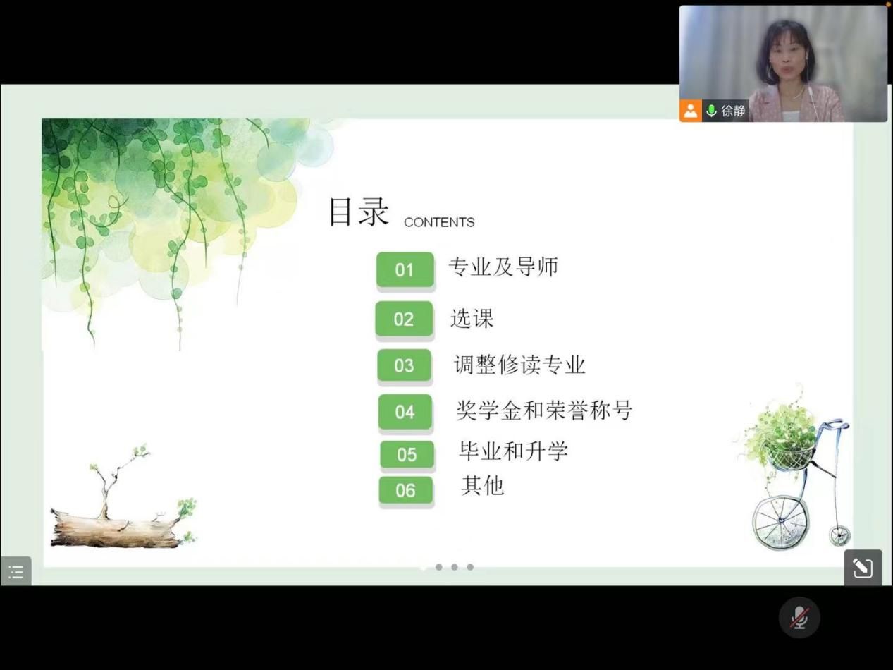 国商2201班班级导师徐静老师从专业及导师、选课、调整修读专业、奖学金、荣誉称号、毕业和升学以及校园生活六个方面给同学们进行详细的解释说明,并为同学们讲解了有关社团、考证和创新项目有关的经验,给同学们在大学期间的选择和时间安排提供了很好的思路。同时,徐老师也建议同学们尽早定下自己未来的发展目标并朝着这个方向不断努力。最后,徐老师用“须知少年凌云志,曾许人间第一流”为同学们今后的学习生活送上了鼓励与祝福。