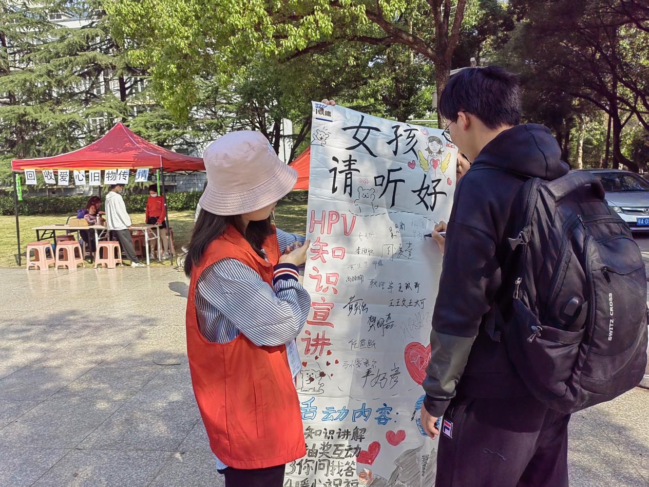 在活动过程中志愿者们分别从HPV是什么、推荐接种HPV疫苗的年龄、HPV疫苗接种剂次等内容进行介绍,告诉同学们HPV不仅可引起宫颈癌,还可导致肛门癌、口腔癌等癌症及皮肤生殖器疣等疾病,加深了同学们对HPV疫苗及“两癌”相关知识的了解。此外,志愿者们对活动方式进行了创新,不仅设计了有趣的问答环节,还邀请了参与的同学们在海报上写下自己的名字、在便签纸上写下对女同学们的祝福语,并围绕“您是否了解HPV”、“你是否知道HPV二价、四价和九价的区别”等问题进行随机采访。同时采用流动宣传与固定摊点相结合的方式进一步普及相关知识。