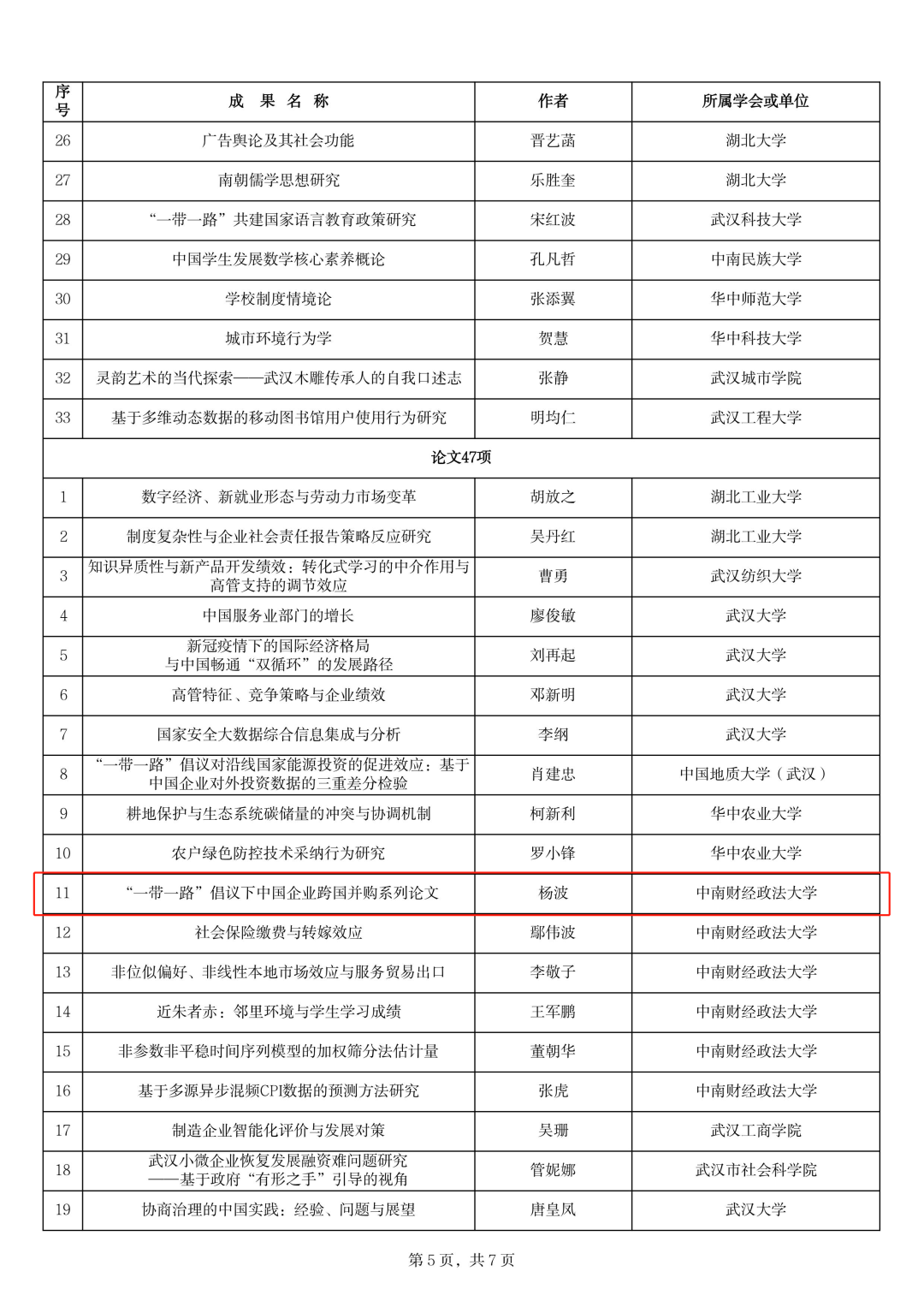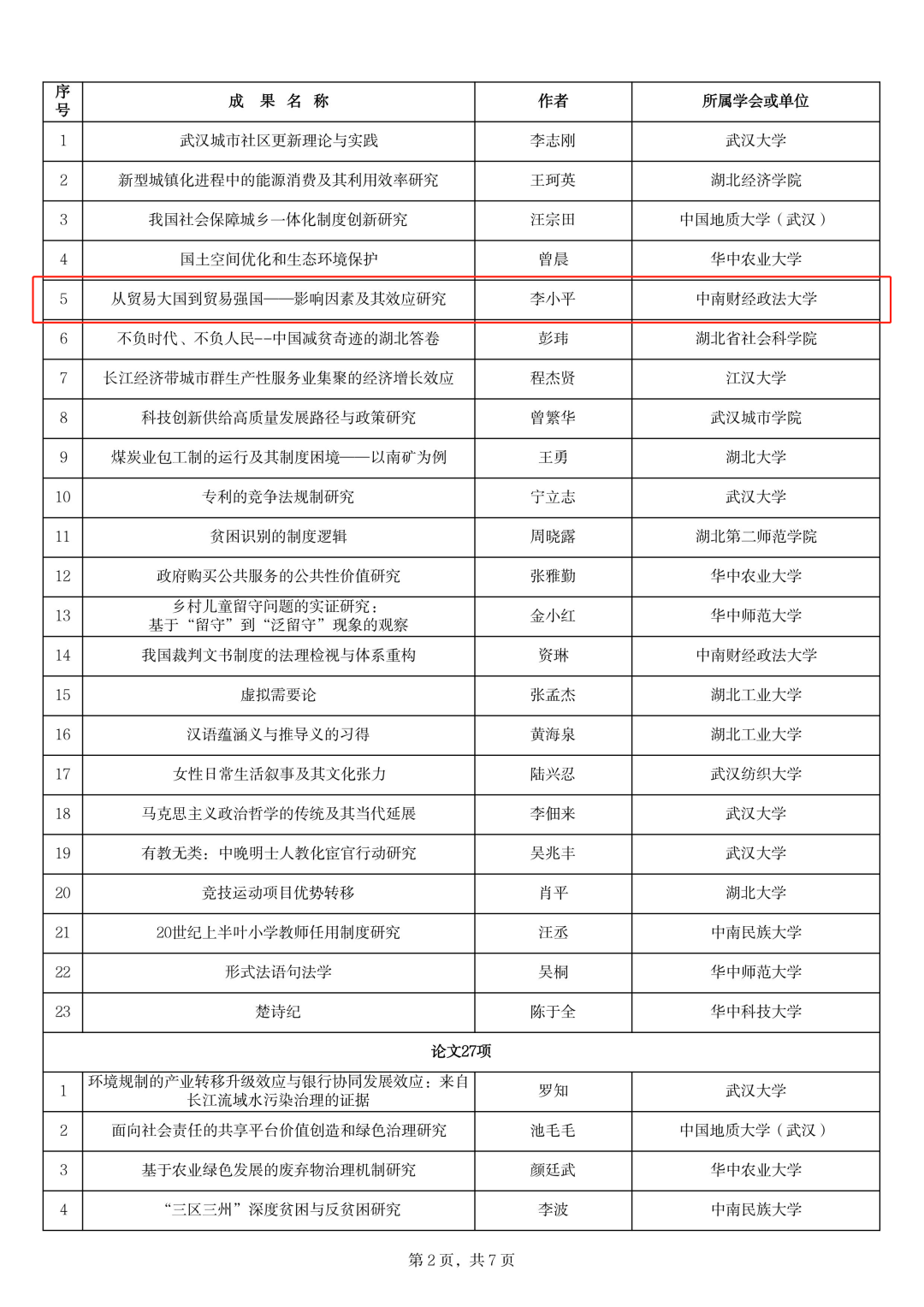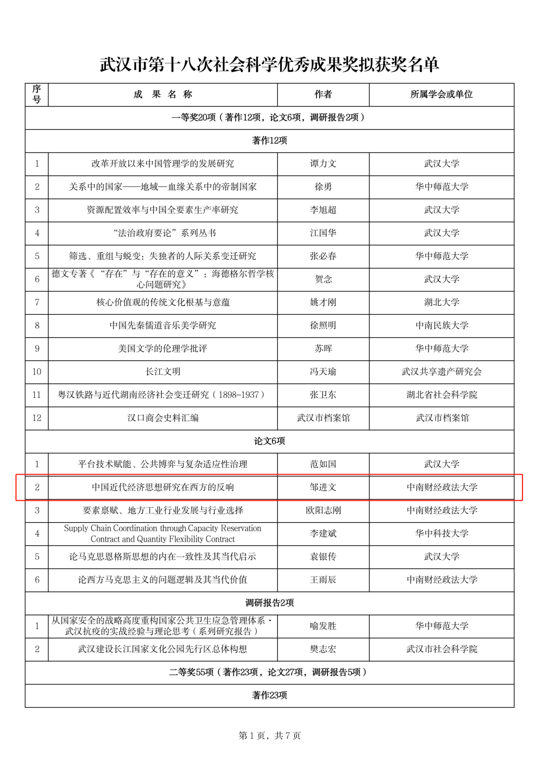 近日,武汉市社会科学奖励工作办公室公示“武汉市第十八次社会科学优秀成果奖拟获奖成果”,经过严格的评审程序,共评出等次奖165项。其中,我院邹进文教授荣获论文一等奖,李小平教授荣获著作二等奖,杨波教授、杨柳青青副教授荣获论文三等奖。