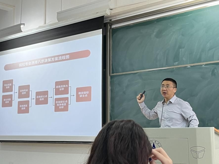谭晓禹老师展示了院校专业选择八步决策方案流程图,提出要根据自己的本专业、兴趣偏好及专业招录情况,以及自己的意向城市选择自己的意向学校与专业。最后谭老师向同学们介绍了考研涉及的所有考试科目。重点在时事政治板块,强调了中国共产党第二十次全国代表大会的重要性,希望同学们提前学习了解、引起重视。