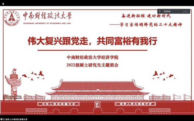 (通讯员 吴康惠)为深入学习宣传贯彻党的二十大精神,全面领会党的二十大报告的重大意义、丰富内涵和精神实质,11月28日下午14时,经济学院2022级硕士研究生以线上形式组织开展了学习贯彻二十大精神主题班会。此次班会由2022级国际商务硕士研究生莫金龙同学主持,研究生工作办公室主任岳明泽老师、研究生辅导员雷菁老师、省教育厅博士生宣讲团成员张钰林同学以及2022级全体硕士研究生参会,参会人数共计140余人。
