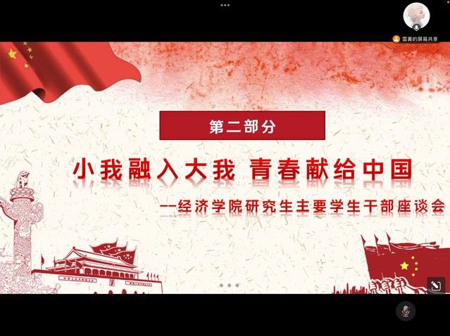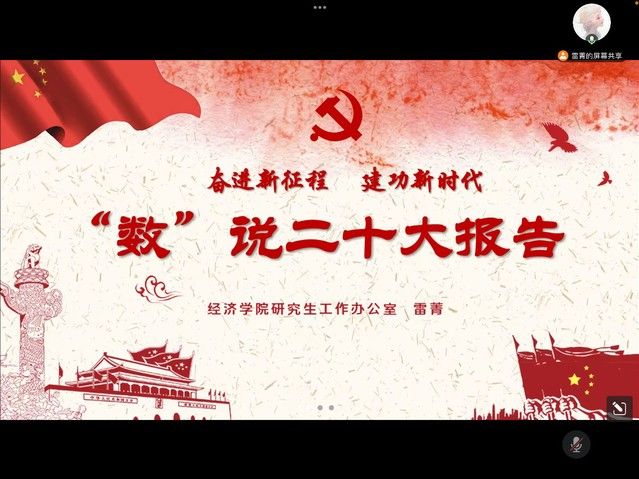 (通讯员 周铮)为深入学习宣传贯彻党的二十大精神,落实学校关于开展“奋进新征程 建功新时代”党的二十大精神主题宣讲活动的工作要求,经济学院研究生工作办公室经集体备课后部署开展“点+线+面”多维度、全覆盖的宣讲活动,即构造了由辅导员及博士宣讲团成员宣讲、学生骨干座谈研讨会、年级主题班会等形式组成的宣讲体系。11月26日,经济学院以线上形式组织开展了研究生骨干二十大精神座谈研讨会,充分发挥研究生干部的模范带头作用。此次座谈研讨会由研究生辅导员雷菁老师主持,研究生工作办公室主任岳明泽老师、各年级研究生主要学生干部参会,参会人数共计30余人。