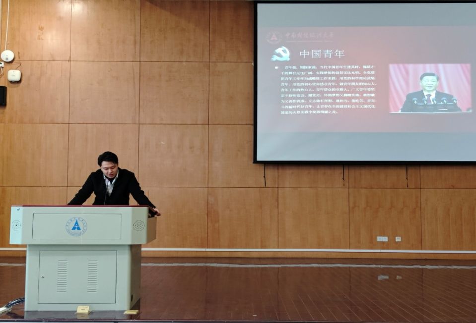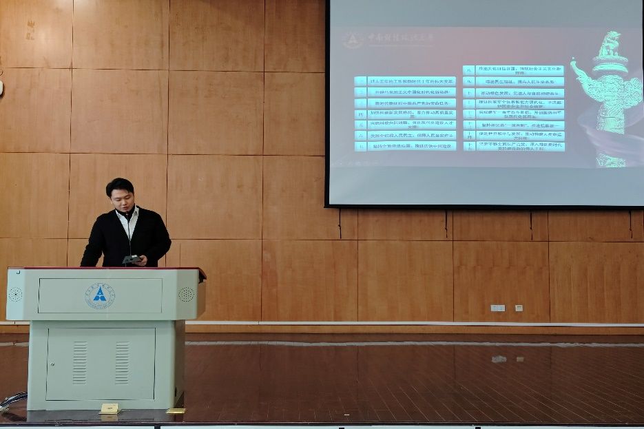 远瞻从“高举中国特色社会主义伟大旗帜、全面贯彻新时代中国特色社会主义思想”的大会主题展开介绍,带领同学们共同学习党的二十大报告十五个部分的相关内容,并和同学们分享交流心得体会。