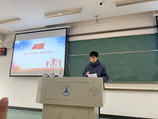 经济1901班的盘意香同学回顾了习近平总书记在党的二十大报告中的讲话,呼吁同学们让青春在全面建设社会主义现代化国家的火热实践中绽放绚丽之花。经济1902班的毛渊同学结合自己立志做好青年的思考,激励大家做一个爱国、懂得团结互助、坚持科学道路、努力奋斗的人。国商1901班的娜菲莎同学分享了正视自我价值的思考,通过介绍情绪价值的含义、释放情绪的网络现象,呼吁同学们矫正情绪、平静向前,成为一个拥有正面情绪价值的人。国商1902班的张志江同学围绕什么是奋斗、奋斗的目的是什么、应该如何奋斗分享了自己的思考。国商1903的杜家汇同学于线上进行了分享,同学们要有学好知识的责任与担当、要有建设好民族国家的责任和担当、要关注世界和人类的命运。